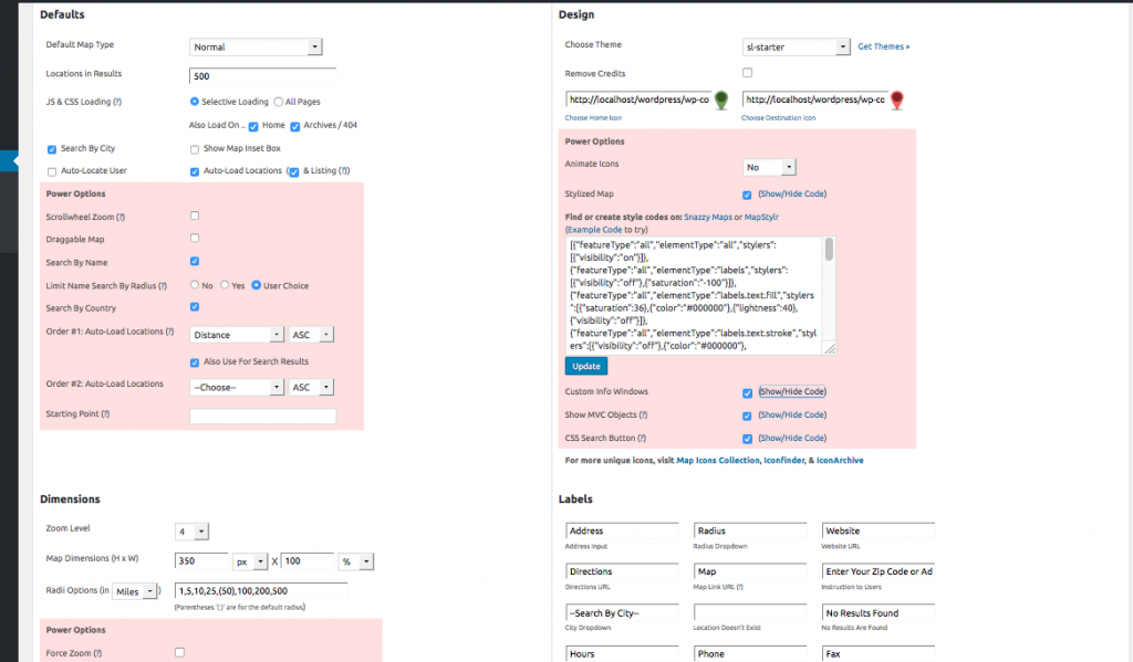 9. Stylized Map: using external map color styling tools such as Snazzy Maps or MapStylr, you can generate code to create the color scheme for your Store Locator map, as desired.  Check this option and copy & paste generated code into this text area field to apply to map
